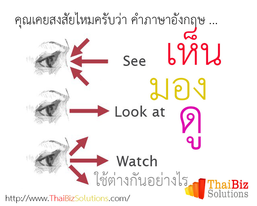 มีนักเรียนบางท่านถามมาว่า “มอง” หรือ “ดู” เนี่ย มันควรใช้คำไหนกันแน่ ระหว่าง See, Watch, Look เรื่องนี้ผมก็เคยไปหาข้อมูลประกอบพร้อมทำวิจัยจากเจ้าของภาษาหลายๆ แหล่ง พร้อมกับใช้ประสบการณ์การศึกษาภาษาอังกฤษส่วนตัว แล้วขอนำมาสรุปให้ฟังแบบนี้นะครับ คือว่าทั้งสามคำนี้เป็น “คำกริยา” (Verb) ทั้งสิ้น 1.) See = เห็น (จะมี “กรรม” มาตามหลัง หรือไม่มีก็ได้ แต่ถ้าจะบอกว่า “เห็นอะไร” นั่นก็แสดงว่ามันต้องมีกรรมมาตามหลัง) หมายถึงทำนองว่า ตาไม่ได้บอด เรา...
