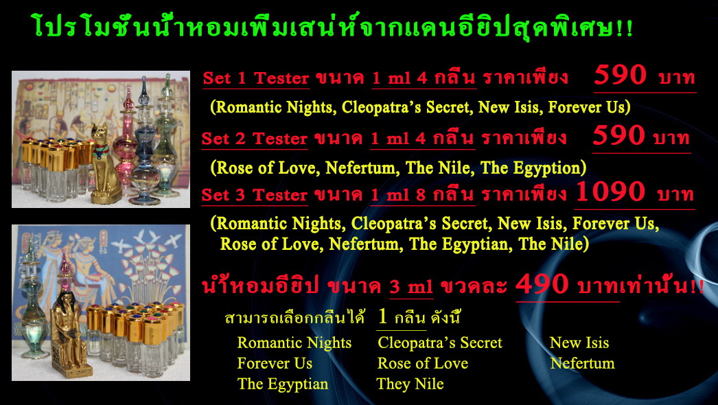 สำหรับน้ำหอมฟีโรโมนจากอียิปต์ สำหรับผู้หญิงทางร้านมีทั้งหมด 8 กลิ่นน่ะคะ สรรพคุณของแต่ละตัวก็จะเหมือนกัน จะต่างกันที่กลิ่นของน้ำหอมน่ะคะ มีขนาดทดลอง 1 ml, ขวด 3 ml และ ขวด 10 ml คะ
